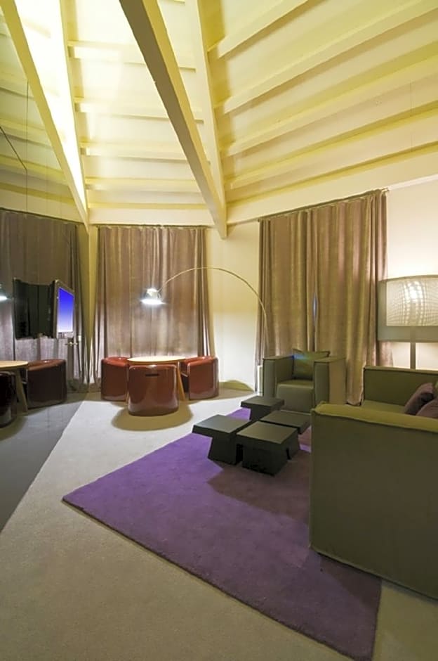This spacious suite has a living room with a sofa, armchair and a table with 4 chairs. It has a hydromassage bath and shower.